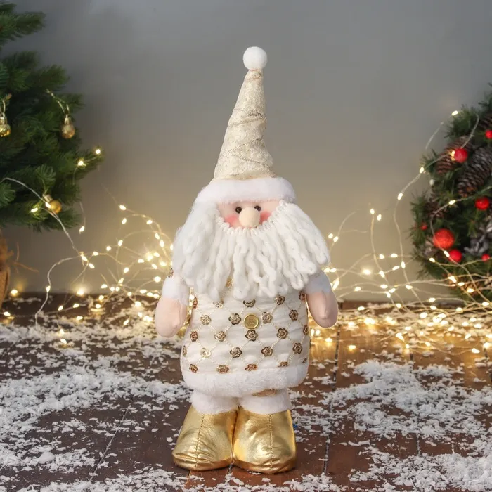 Большая мягкая фигурка в виде снеговика с полосатым колпаком и длинными ногами станет ярким украшением зимнего интерьера или праздничного декора к Новому году. Эта игрушка выполнена в стиле новогоднего барокко, что придает ей особую изысканность и праздничное настроение. Размер — 48×23 см, она отлично подойдет для оформления дома или в качестве подарка для любителей зимних персонажей.