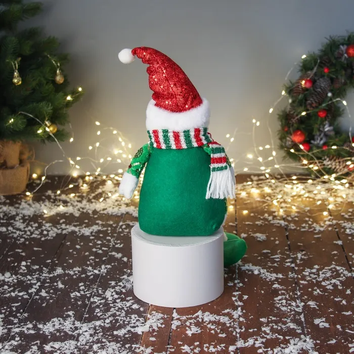 Мягкая новогодняя игрушка в виде снеговика в сияющем костюме и шарфике станет ярким украшением праздничного интерьера или оригинальным подарком. Эта фигурка выполнена в стиле новогоднего барокко, сочетая красно-зеленые оттенки с изящными деталями. Размер — 49 см в высоту и 19 см в ширину, что делает её заметным элементом декора для дома, елки или зимних мероприятий. Мягкое тело с мягконабивными частями создает приятные тактильные ощущения и обеспечивает долговечность. Наличие ног у снеговика придает ему реалистичный силуэт, а его праздничный костюм подчеркивает новогоднюю тематику. Игрушка не оснащена подставкой и не требует питания, что облегчает её размещение в различных интерьерах.