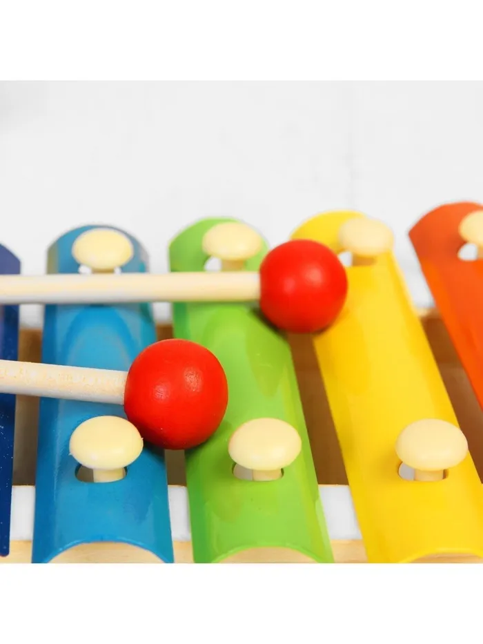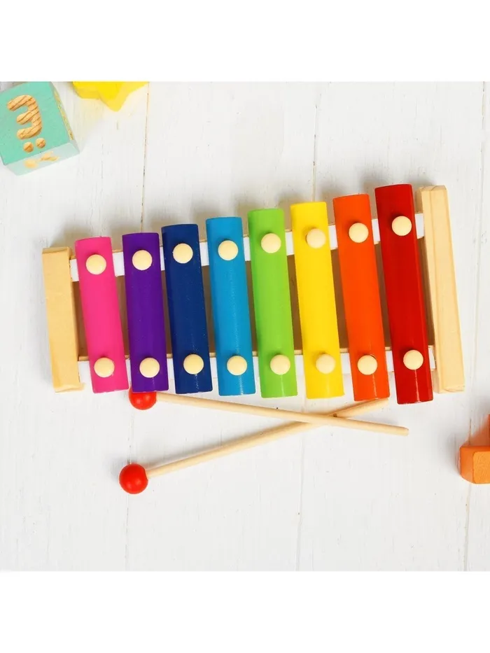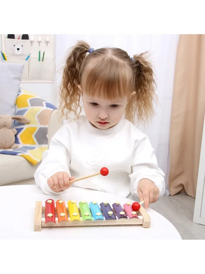 Металлофон — это музыкальная развивающая игрушка. Пусть ребёнок бьёт молоточками или палочками по металлическим пластинкам и извлекает из них свою мелодию. Звонкие элементы расположены горизонтально вдоль деревянного корпуса. Каждый из них имеет свой цвет, благодаря чему ребёнок хорошо запоминает алгоритм действий.