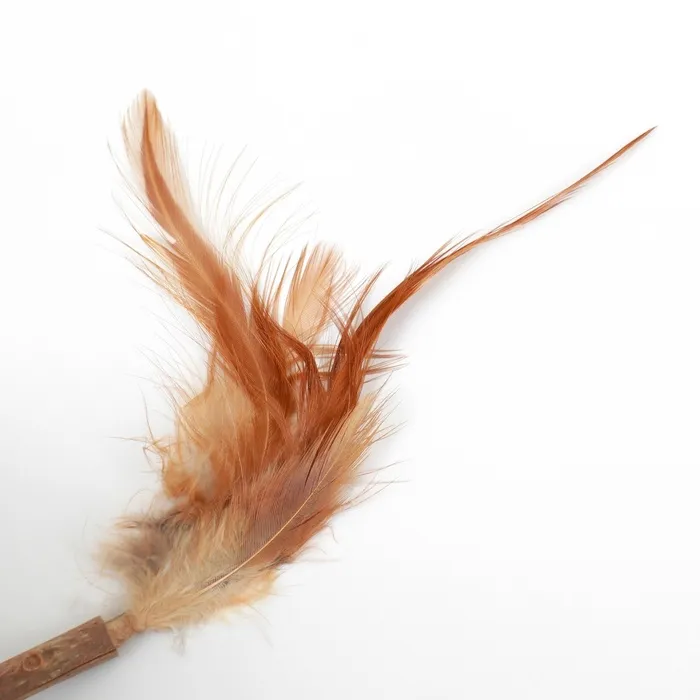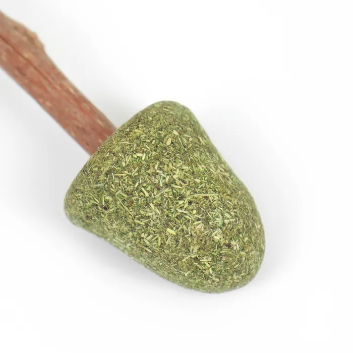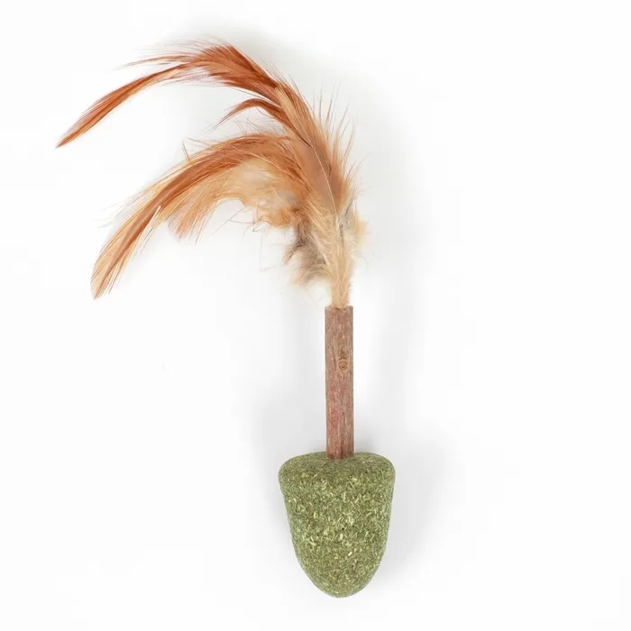 Прессованная мята прикреплена к палочке из мататаби - это натуральное растение, которое обладает особым ароматом и активными веществами, которые привлекают кошек и стимулируют их играть и жевать палочки. Сверху представлены пушистые перья.