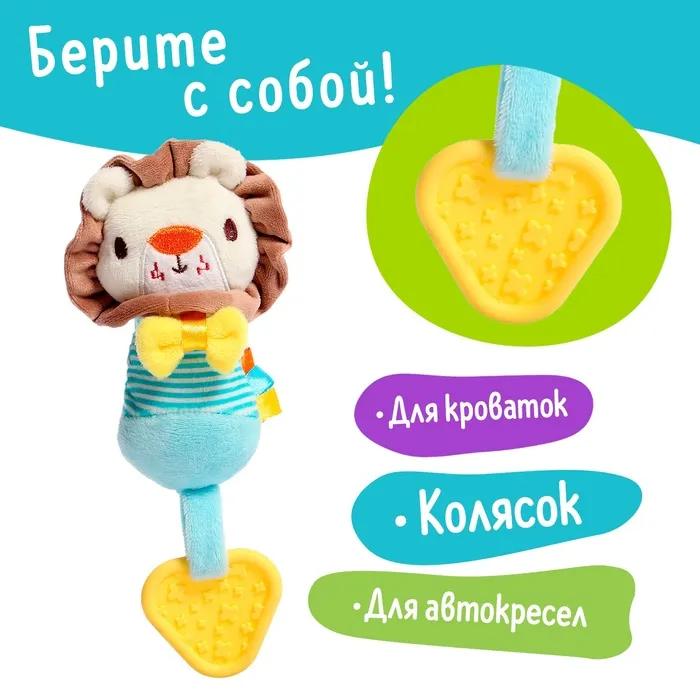 Малыш с радостью встретит нового друга — мягкого львёнка! Эта яркая и забавная игрушка станет незаменимым спутником в период прорезывания зубов. Мягкое тельце львёнка приятно ощущать в руках, а текстура прорезывателя поможет облегчить зуд и боль дёсен.