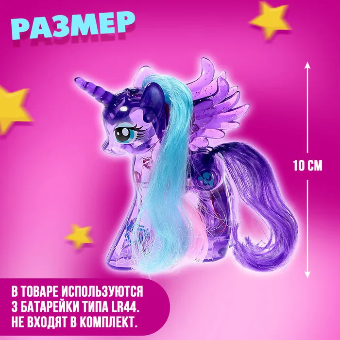 - У лошадки светится голова и туловище. Для работы необходимы 3 батарейки типоразмера LR44, в комплекте.