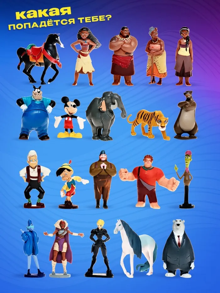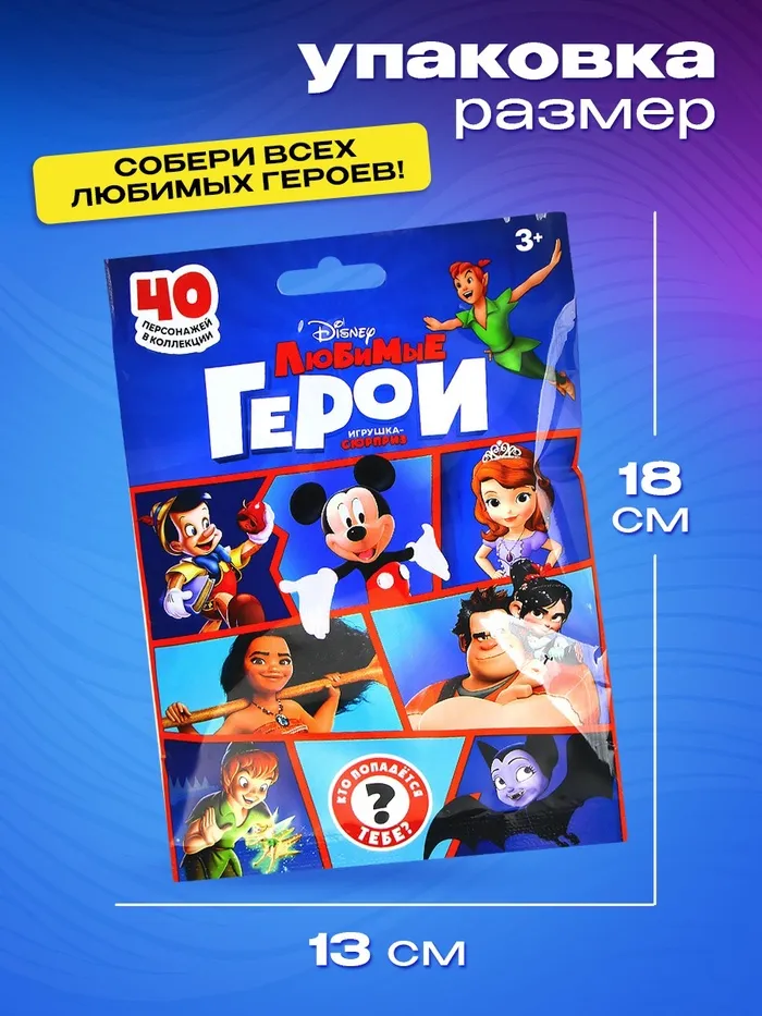 Готов к волшебному сюрпризу? В этом пакетике спрятана одна из 40 возможных фигурок Disney! Кто попадётся именно тебе? Хитрый Питер Пэн или добрая София? Весёлый Микки Маус или отчаянная Моана? Может, сильный Ральф или загадочная Малефисента? Открывай скорее — мир сказочных приключений уже ждёт!