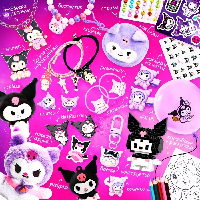 - Дополнительные сюрпризы: значок, воздушный шарик, цепочка с подвеской, джибитсы и наклейки для ногтей.