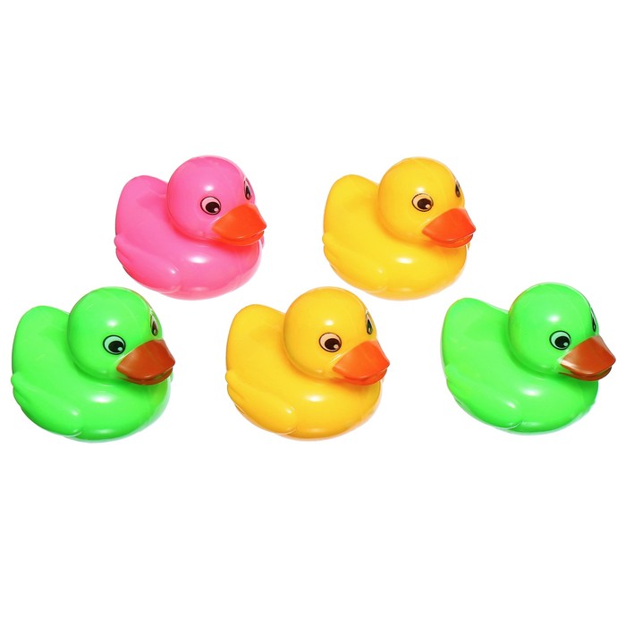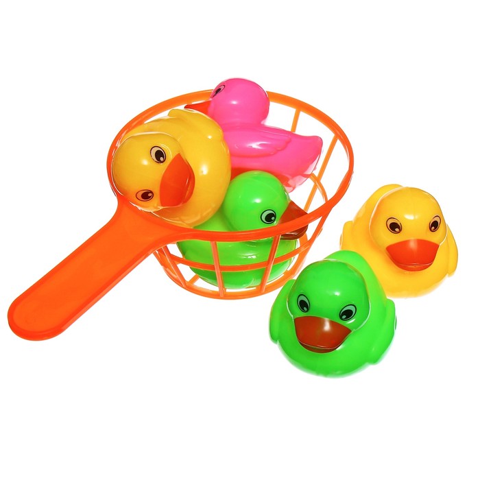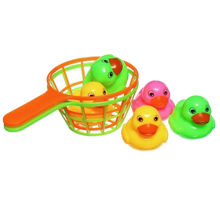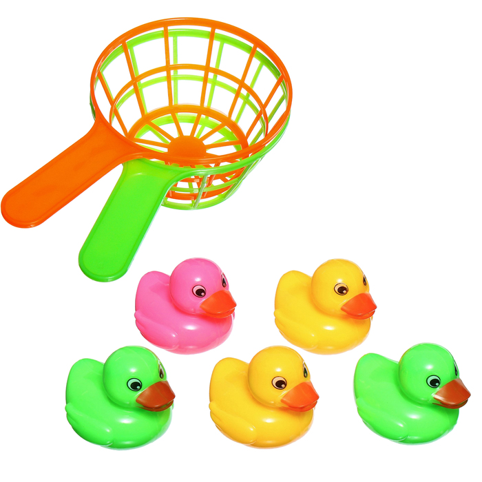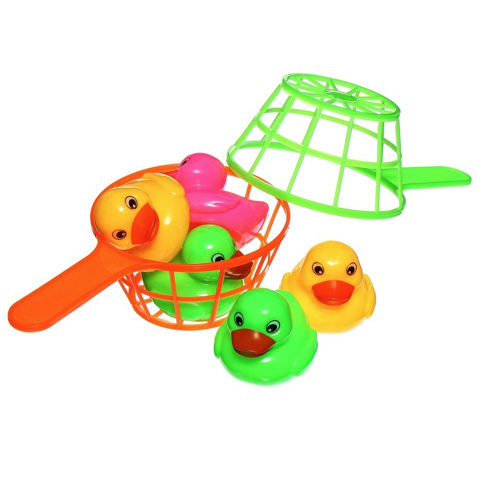 - В наборе 5 уточек и 2 удобных сачка. Каждая игрушка выполнена из качественного пластика и окрашена в яркие цвета.