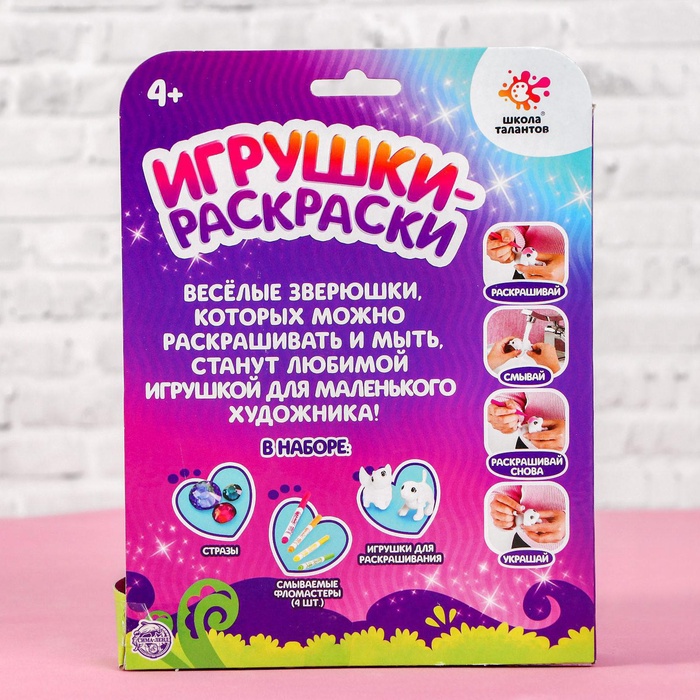 С набором юные художники смогут расписать фигурки кошечки и зайчика на свой вкус! В комплект входит всё необходимое для раскрашивания. После того, как ребёнок изготовит зверюшек, с ними можно будет играть, а затем смывать и раскрашивать по-новому!