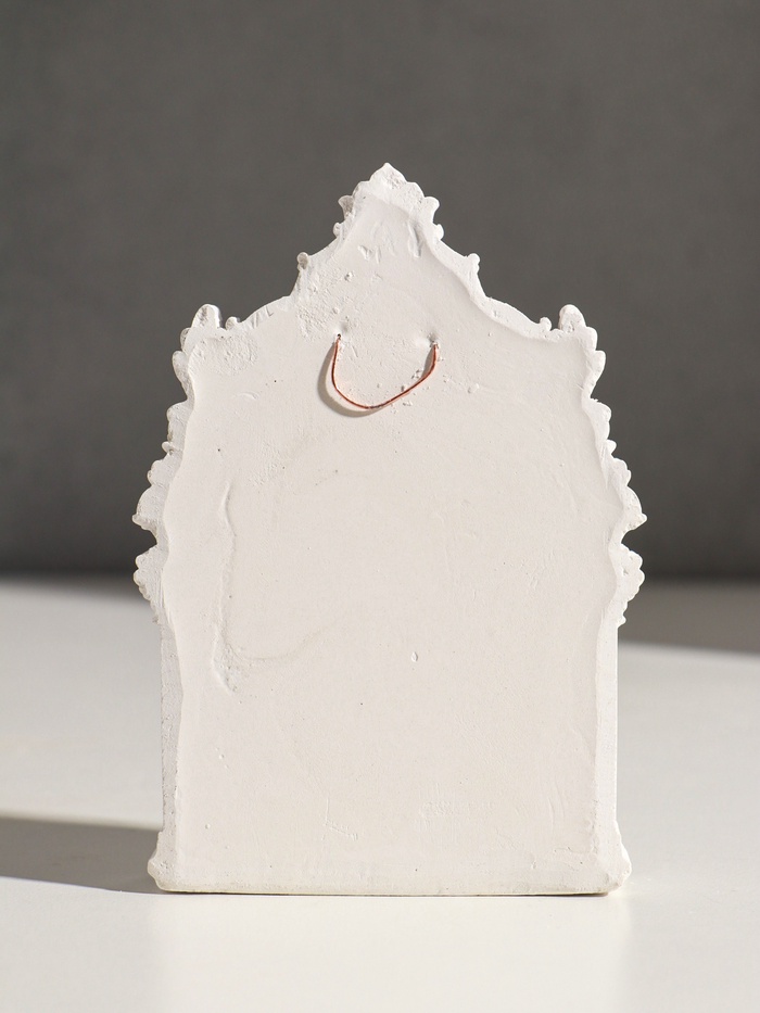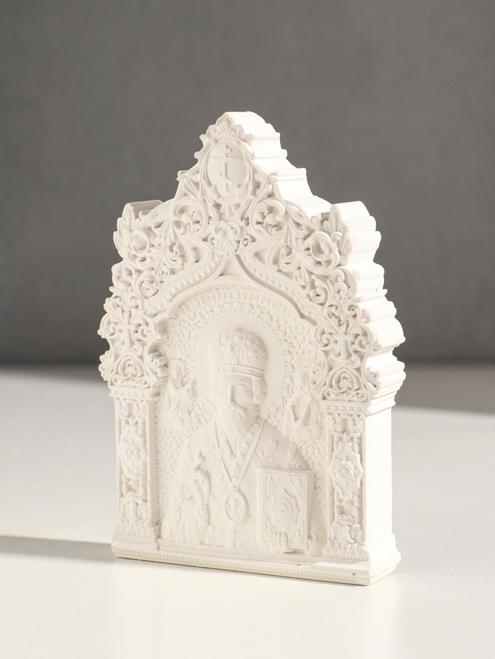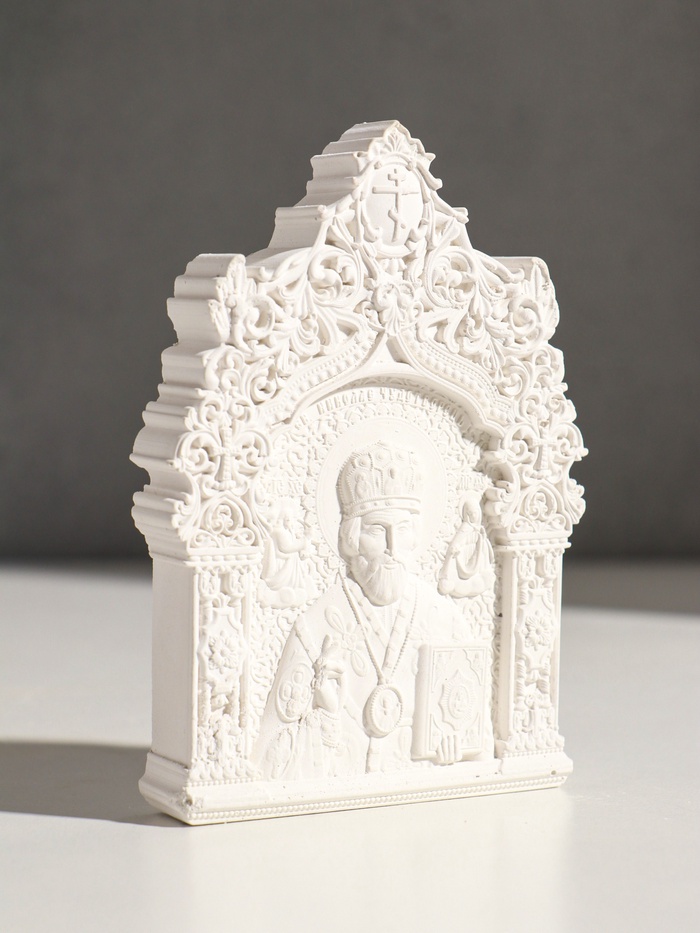 Эта икона из гипса станет центром вашего домашнего молитвенного уголка. Образ святителя Николая, выполненный с глубоким почтением, создаёт атмосферу умиротворения и духовной сосредоточенности. Компактный формат делает его идеальным личным спутником в путешествиях.