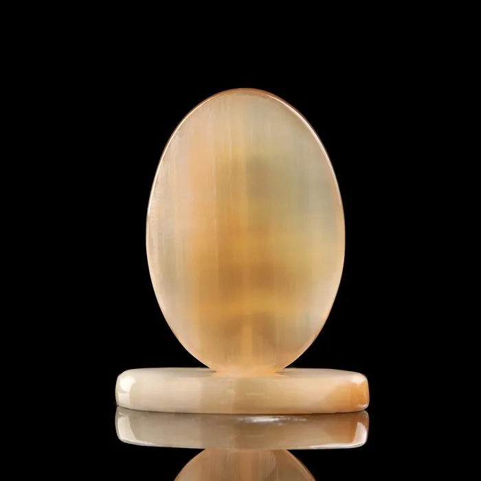 Селенит — это материал, который относится к разновидности гипса, жёлто-розового цвета с шелковистым блеском. Внутренние волокна расположены плотно, это даёт эффект «кошачьего глаза». Изделия из селенита завораживают игрой света, нежными тонами и хрупкостью. При прикосновении есть ощущение исходящей энергии.