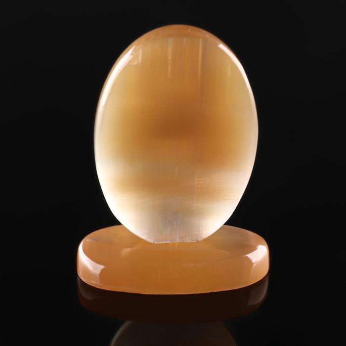 Селенит — это материал, который относится к разновидности гипса, жёлто-розового цвета с шелковистым блеском. Внутренние волокна расположены плотно, это даёт эффект «кошачьего глаза». Изделия из селенита завораживают игрой света, нежными тонами и хрупкостью. При прикосновении есть ощущение исходящей энергии.