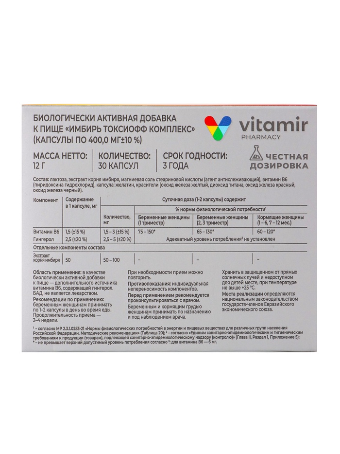Имбирь ТоксиОФФ «Витамир» TETRALAB — безопасный растительный комплекс, разработанный для облегчения симптомов токсикоза у беременных. Препарат содержит экстракт имбиря, который способствует снижению тошноты, дискомфорта и поддерживает общее самочувствие во время беременности.
