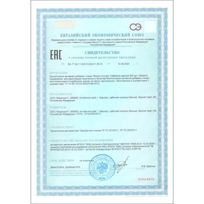 Состав: носитель целлюлоза микрокристаллическая (Е460i), экстракт брокколи (индол-3-карбинол), крахмал картофельный, антислеживающий агент Е470