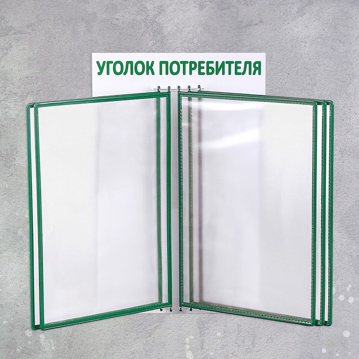Информационный стенд «Уголок потребителя» перекидная система на 5 карманов А4, зелёный — Характеристики