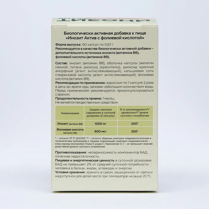 Состав: Инозит (Витамин В8), оболочка капсулы: желатин свиной, титана диоксид (краситель); диоксид кремния аморфный (агент антислеживающий), кальциевая соль стеариновой кислоты (агент антислеживающий), фолиевая кислота (Витамин В9).