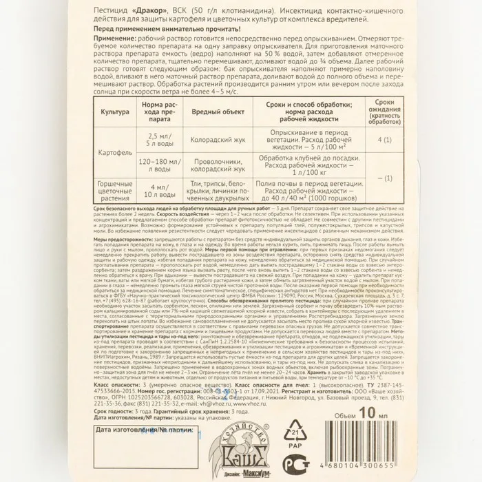 Инсектицид для защиты картофеля и цветочных культур "Дракор", 10 мл — Характеристики