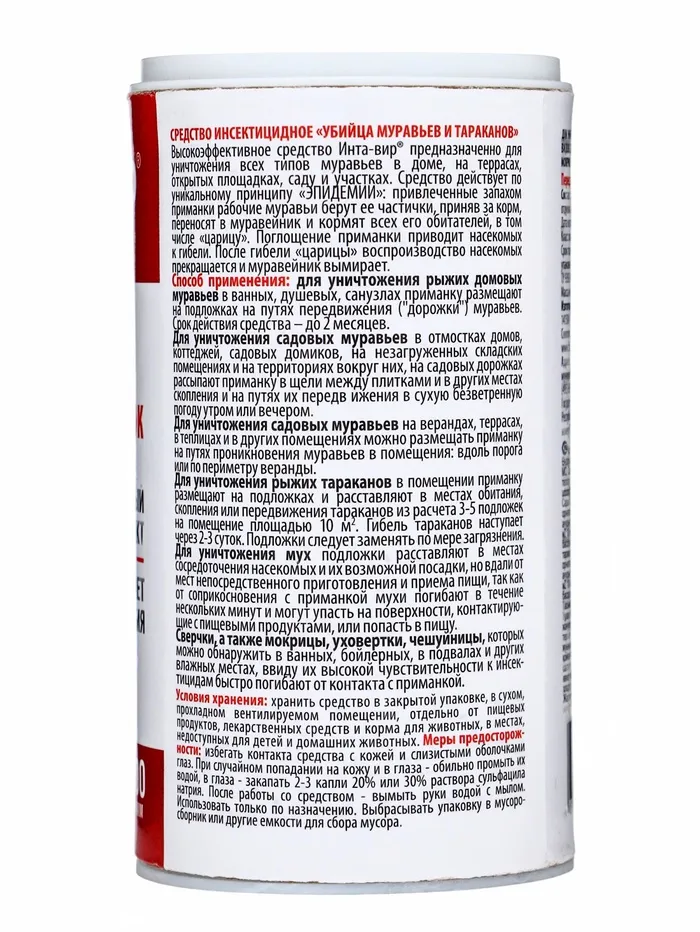 Инсектицидное средство от муравьев "Инта-вир" представляет собой эффективное средство для уничтожения муравьев в доме, на даче и в других помещениях. Препарат разработан на основе современных технологий и обладает высокой эффективностью в борьбе с муравьями.