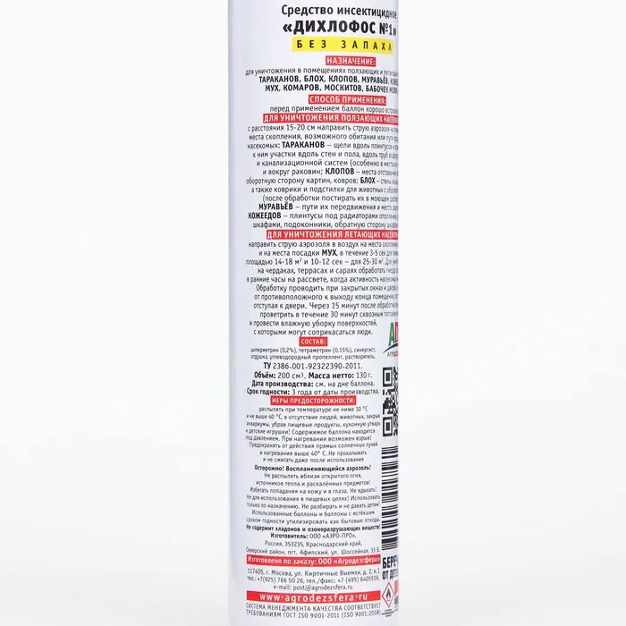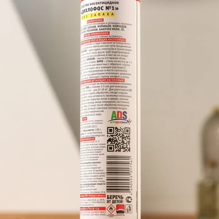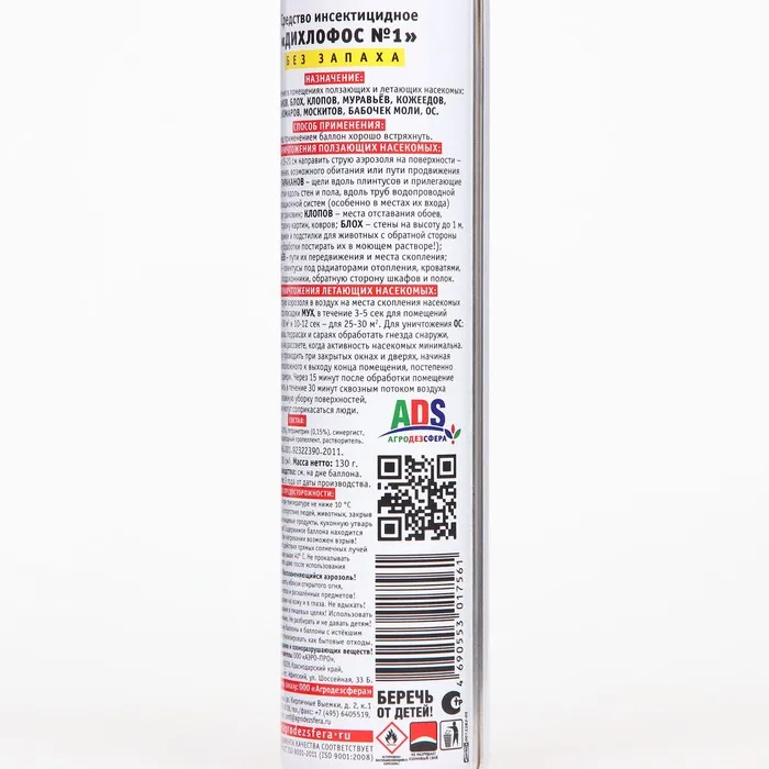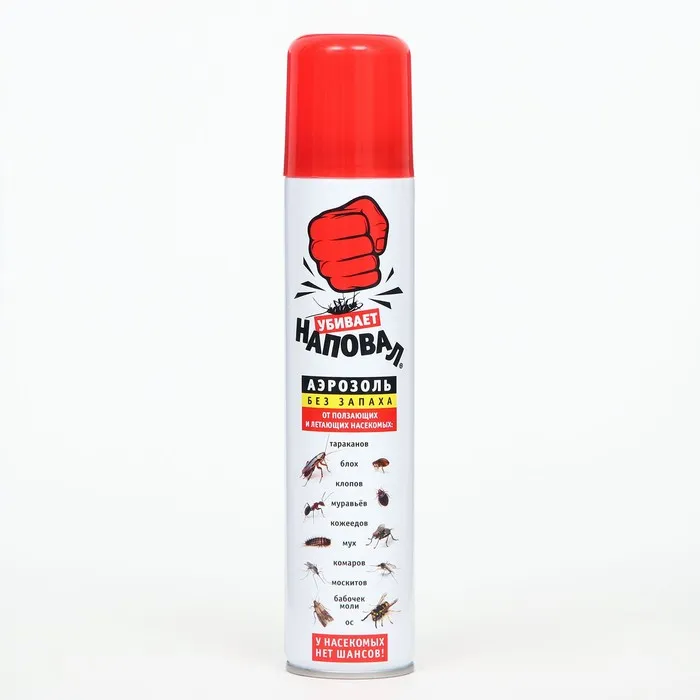 Средство инсектицидное Дихлофос №1 без запаха НАПОВАЛ - это инсектицидное средство для уничтожения в помещениях летающих и ползающих насекомых: тараканов, блох, клопов, муравьев, кожеедов, мух, комаров, москитов, бабочек моли, ос. Способ применения: Перед применением баллон хорошо встряхнуть. Для уничтожения ползающих насекомых с расстояния 15-20 см направить струю аэрозоля на поверхности- места скопления, возможного обитания или пути продвижения насекомых: тараканов- щели вдоль плинтусов и прилегающие к ним участки вдоль стен и пола, вдоль труб водопроводной и канализационной систем; клопов- места отставания обоев, обратную сторону картин, ковров; блох- стены на высоту до 1м, а так-же коврики и подстилки для животных с обратной стороны (после обработки постирать их в моющем растворе!); муравьев- пути передвижения и места скопления; кожеедов- плинтусы под радиаторами отопления, кроватями, шкафами, подоконники, обратную сторону шкафов и полок. Для уничтожения летающих насекомых: направить струю аэрозоля в воздух на места скопления насекомых и на места посадки мух в течение 3-5 сек. для помещений площадью 14-18 кв.м. и 10-12 сек. для помещений 25-30кв.м. Для уничтожения ос на чердаках, террасах и сараях обработать гнезда снаружи в ранние часы на рассвете, когда когда активность насекомых минимальна.Обработку проводить при закрытых окнах и дверях, через 15 минут помещение проветрить в течение 30 минут сквозным потоком воздуха и провести влажную уборку поверхностей, с которыми могут соприкасаться люди.Составциперметрин 0,2%, тетраметрин 0,15%, синергист, отдушка, углеводородный пропеллент, растворитель