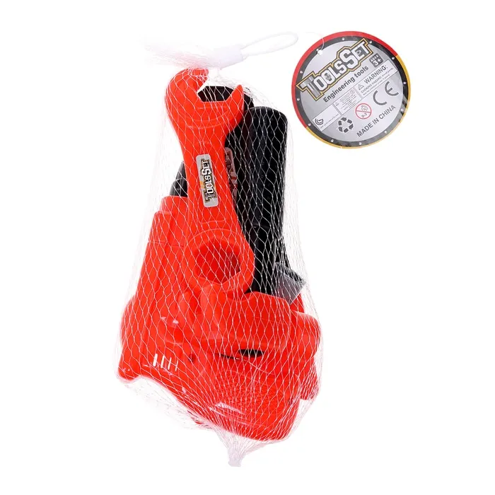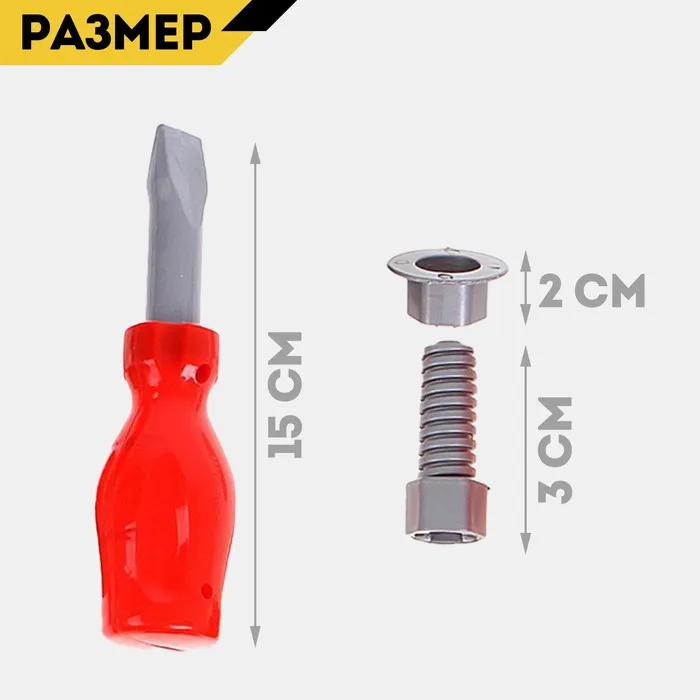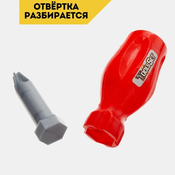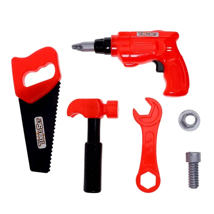 - Комплект включает отвёртку, ножовку, разводной ключ, молоток, шуруповёрт, болт и гайку — всё, как у взрослых!