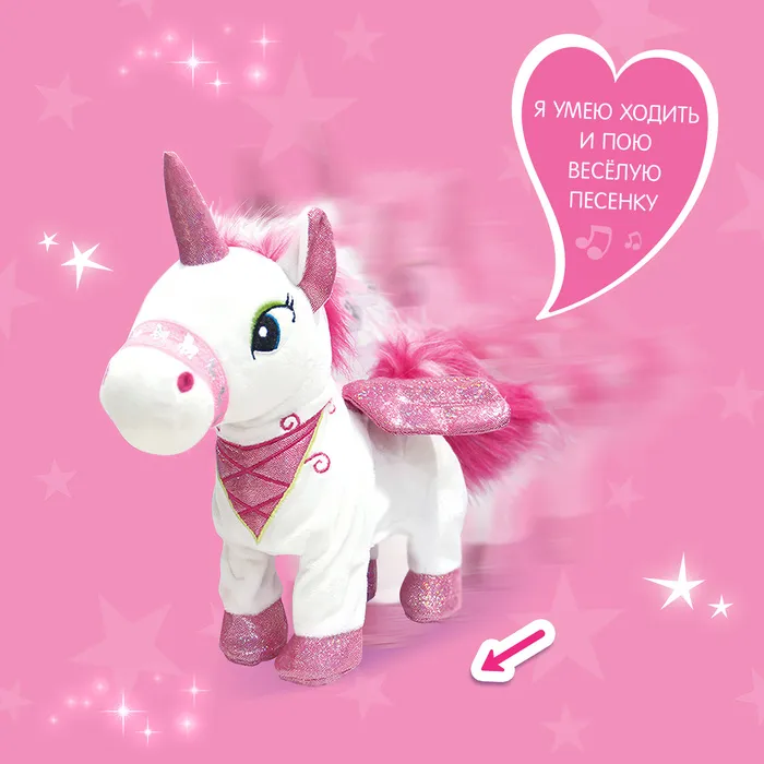 Единорожка легко управляется с помощью кнопочки на поводке. Он умеет ходить, озорно виляя пушистым хвостиком. Её крылышки сверкают. Лошадка машет головой. Питомец издаёт звуки как настоящая лошадка (ржание и цокот копыт) и поёт весёлую песенку.