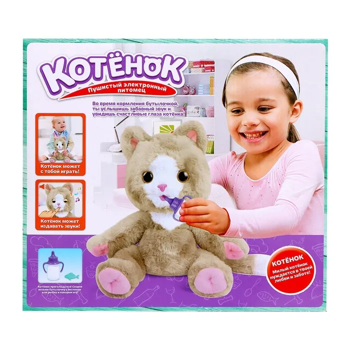 Мягкая шёрстка приятна на ощупь. Вы можете поухаживать за питомцем и покормить его из бутылочки. Когда он ест, он издаёт забавный звук. А ещё вы увидите счастливые глаза котёнка!