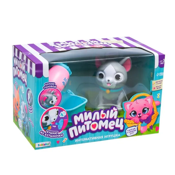 Питомец реагирует только на свою бутылочку. Котик лижет её, аппетитно причмокивая язычком. А также у него светятся глазки, и он забавно качает головой.