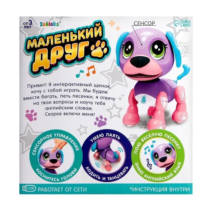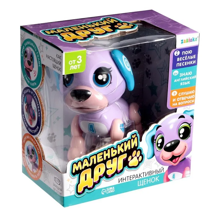 Интерактивная игрушка-щенок «Маленький друг», поёт песенки, отвечает на вопросы, цвет фиолетовый — Характеристики