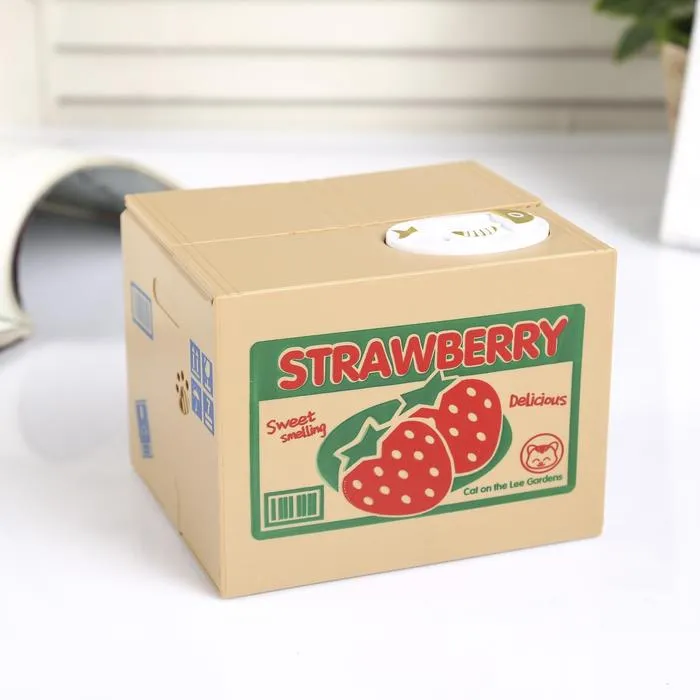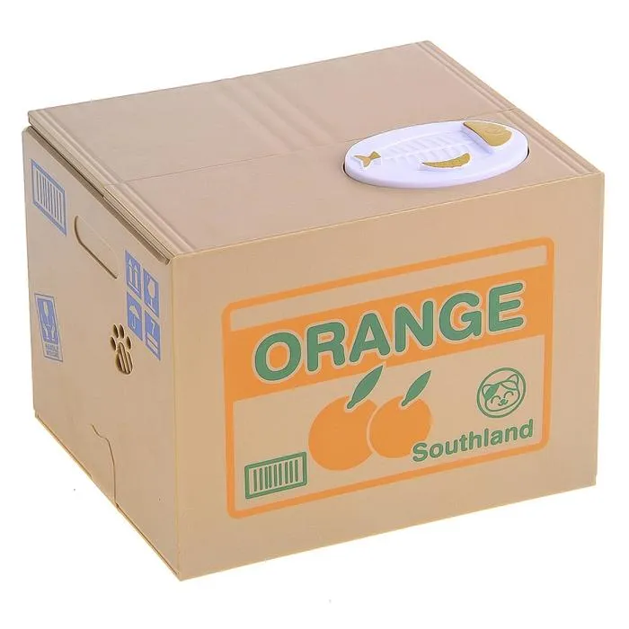 Положите монетку на тарелочку сверху копилки, крышка приоткроется, и осторожная, но предприимчивая кошечка высунет лапку и застенчиво заберет монетку в копилку!