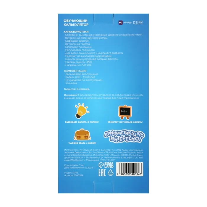 Интерактивный калькулятор детский Windigo, для изучения счёта, голубой — Характеристики