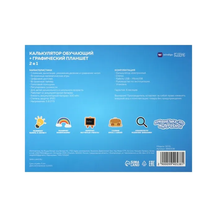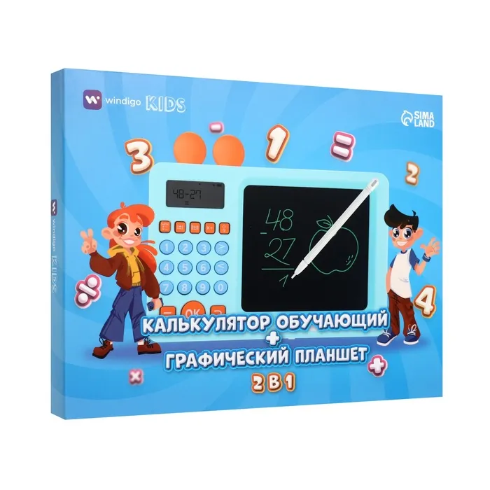 Интерактивный калькулятор детский Windigo, для изучения счёта + графический планшет, голубой — Характеристики
