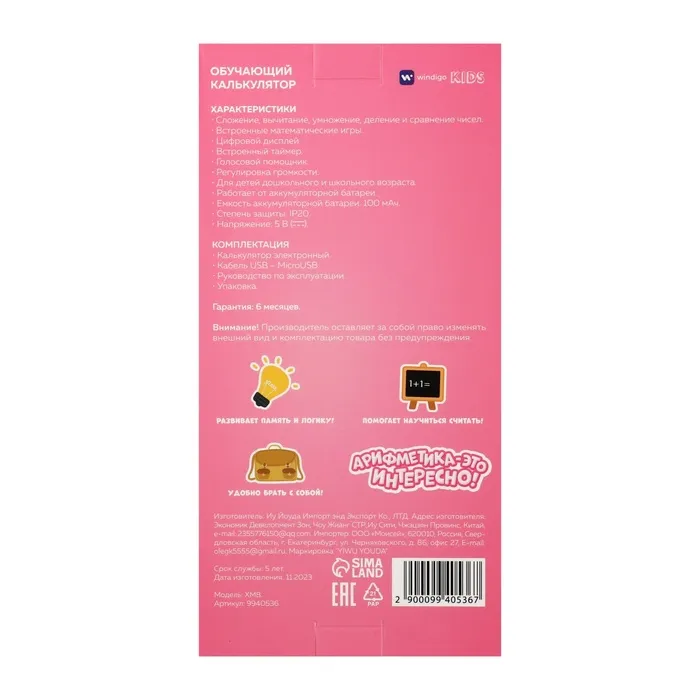 Интерактивный калькулятор детский Windigo, для изучения счёта, розовый — Характеристики