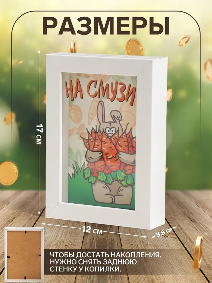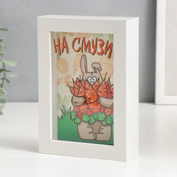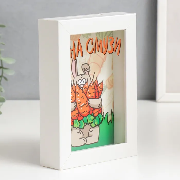 Интерьерная копилка для купюр и монет «Заяц с морковками. На смузи», пластик, 17×12×3.8 см — Характеристики