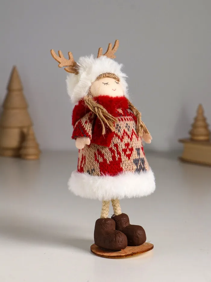 - Нежный образ в вязаном наряде: Куколка одета в стильное платье и забавную шапочку с рожками. Этот гармоничный образ создаёт ощущение уюта и по-домашнему тёплой атмосферы, что делает игрушку прекрасным элементом декора.