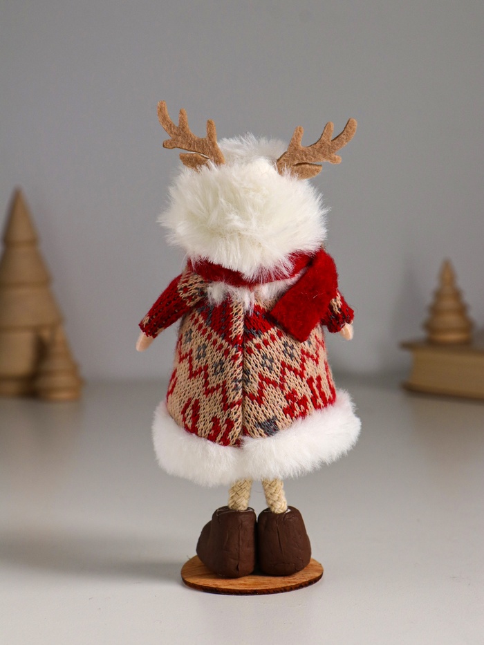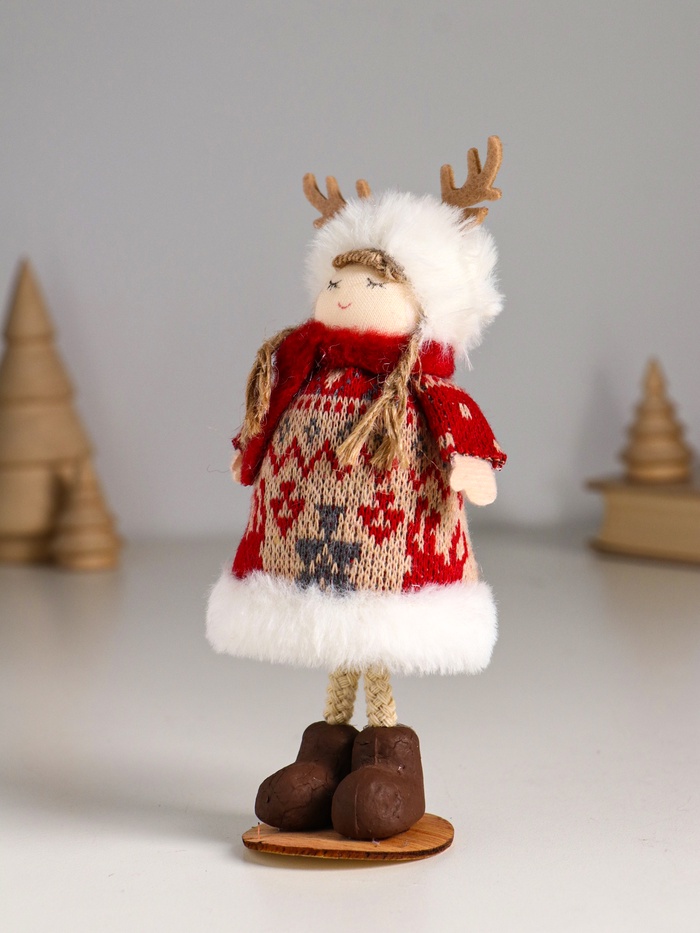 Интерьерная кукла текстильная «Малышка в вязаном платье в шапке с рожками», 6.5×6.5×16.5 см — Характеристики