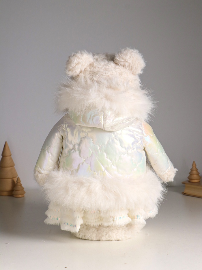 - Уютный зимний образ: Кукла одета в нарядный белый пуховик и костюм животного. Тёплый образ создаёт новогоднее настроение и делает её идеальным персонажем для ролевых игр в холодное время года.