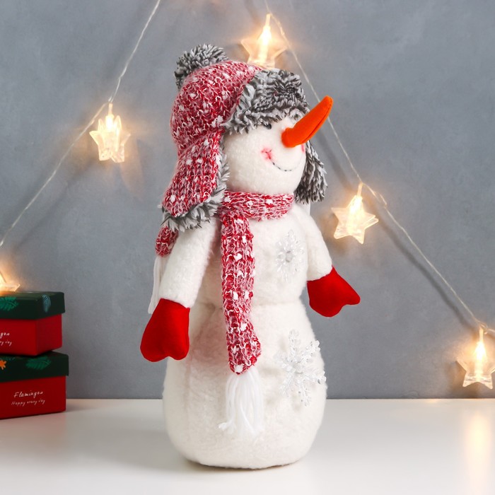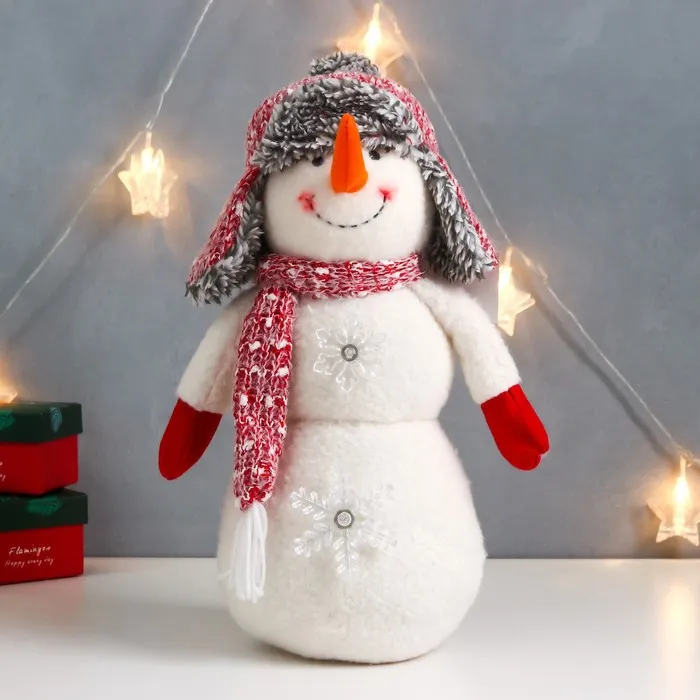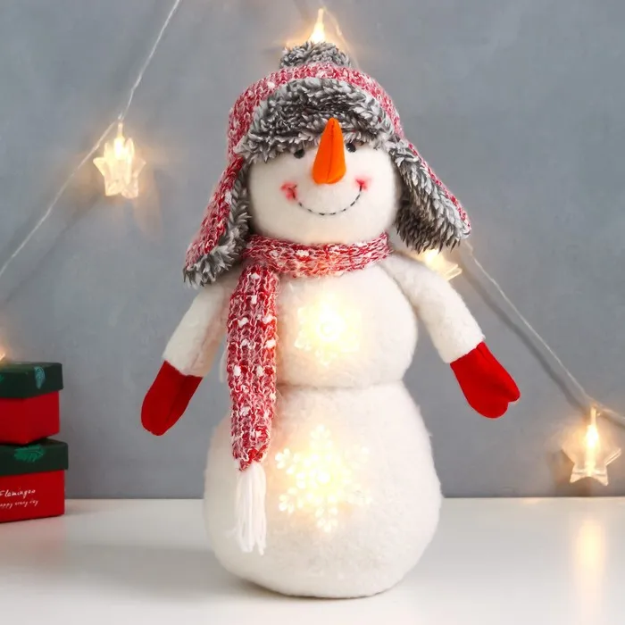 Интерьерная кукла текстильная «Снеговичок в шапке-ушанке с бамбошкой», светящаяся, 40×21×12 см — Характеристики