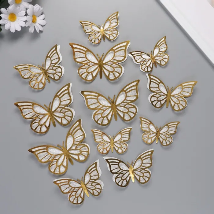 Наклейка бумага, пластик "Бабочки, серебристый глиттер" набор 12 шт 12 см, 10 см 8 см