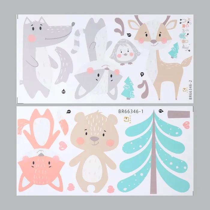 Наклейка пластик интерьерная цветная "Зверушки в еловом лесу" набор 2 листа 30х60 см