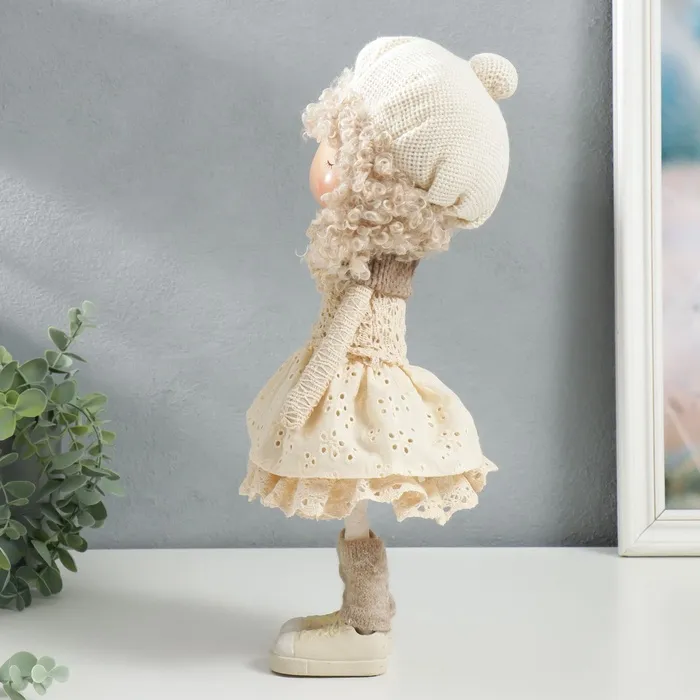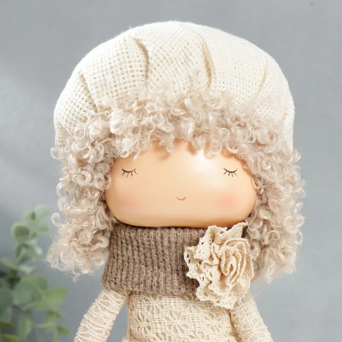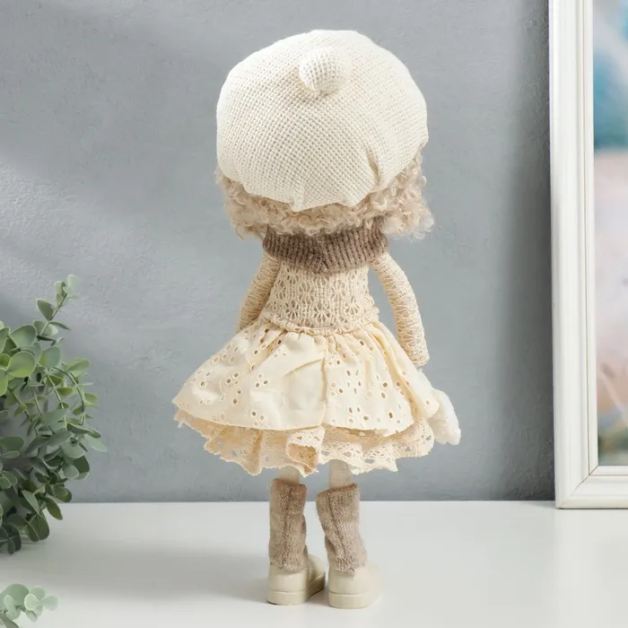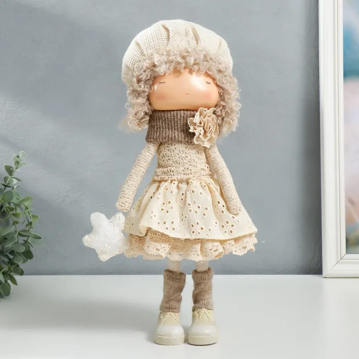 Интерьерная текстильная кукла «Малышка в берете, в бежевом наряде, с цветком», 36,5х13х17 см — Характеристики