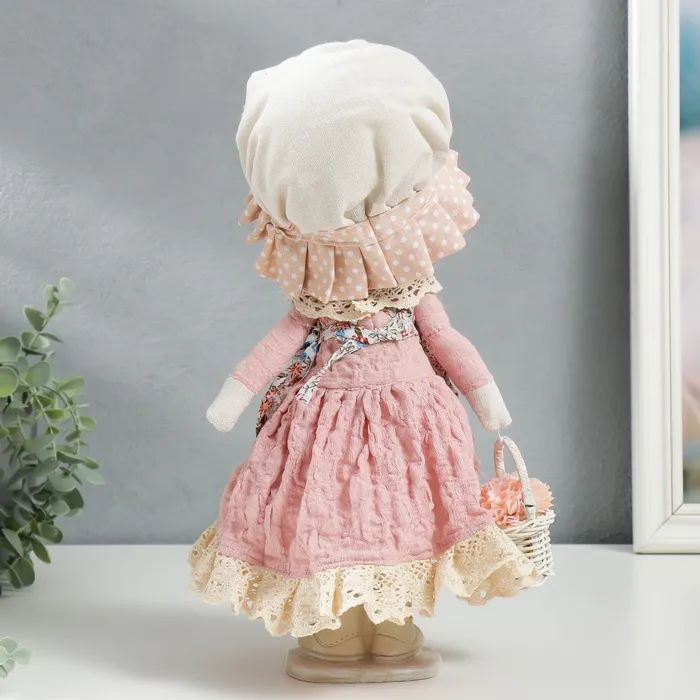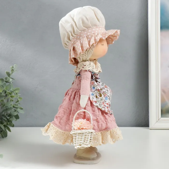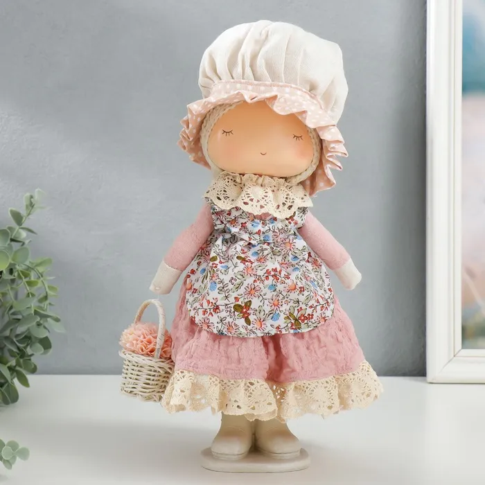 Интерьерная текстильная кукла «Малышка в чепчике и переднике цветочном, с корзиной цветов», 33х14х16 см — Характеристики