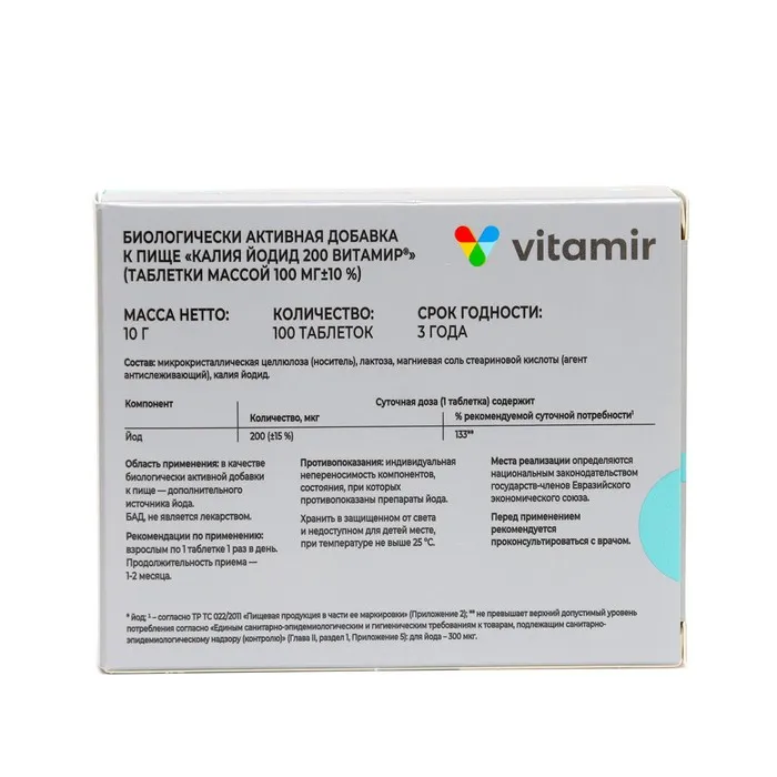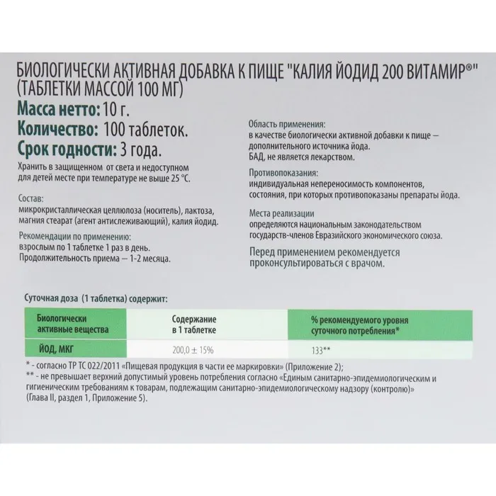 Состав: калия йодид, микрокристаллическая целлюлоза (носитель), лактоза, магния стеарат (агент антислеживающий).