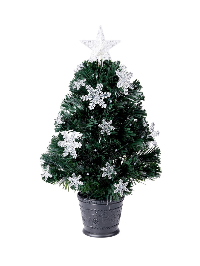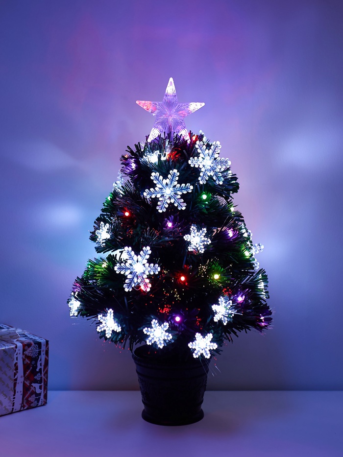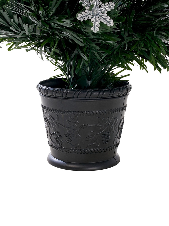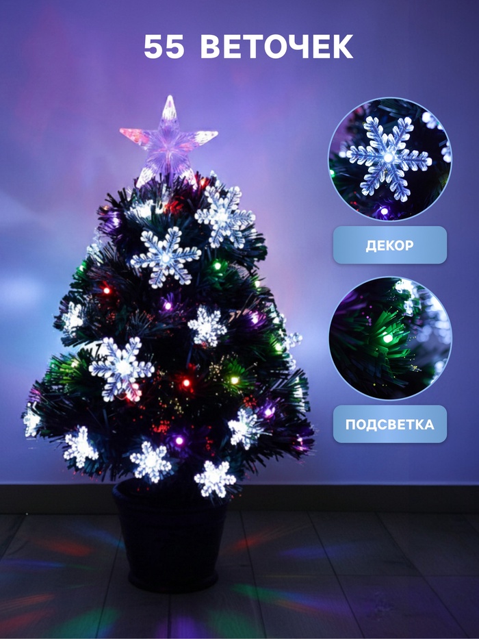 Фиброоптическая настольная ёлка высотой 60 см с диаметром нижнего яруса 35 см и 55 отгибающимися ветками станет стильным акцентом вашего праздничного декора. Подсветка оживляет хвою и создаёт мягкое мерцание, привлекая внимание и наполняя комнату атмосферой праздника.
