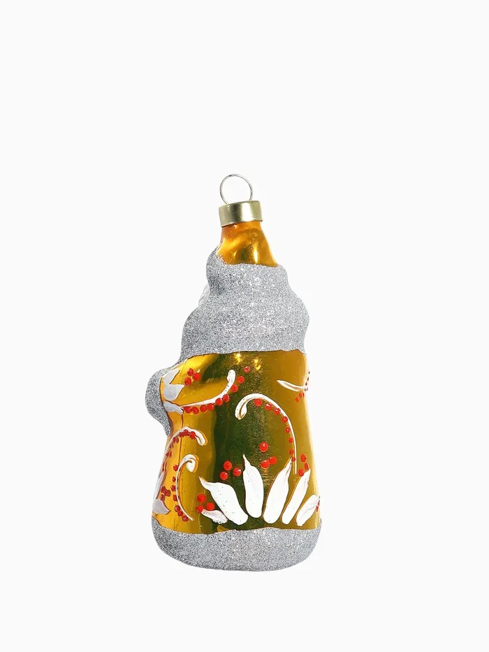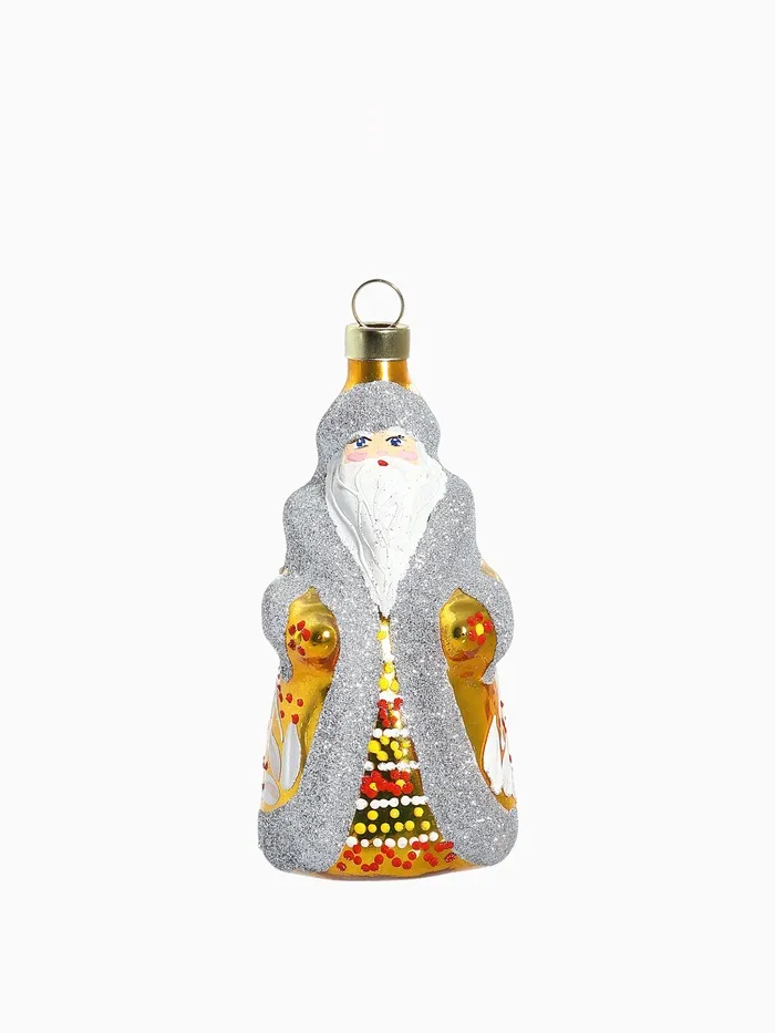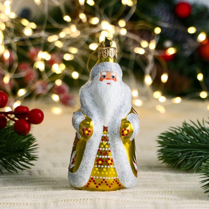 Стеклянная игрушка в виде Деда Мороза высотой 12 см с ручной росписью и золотистым оттенком станет изысканным украшением для вашей ёлки. Этот элемент декора, выполненный в советском и фьюжн стилях, придаёт празднику уникальность и тепло. Каждая фигурка создаётся вручную, что подчеркивает её индивидуальность и качество.