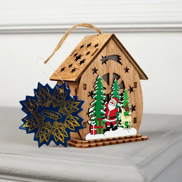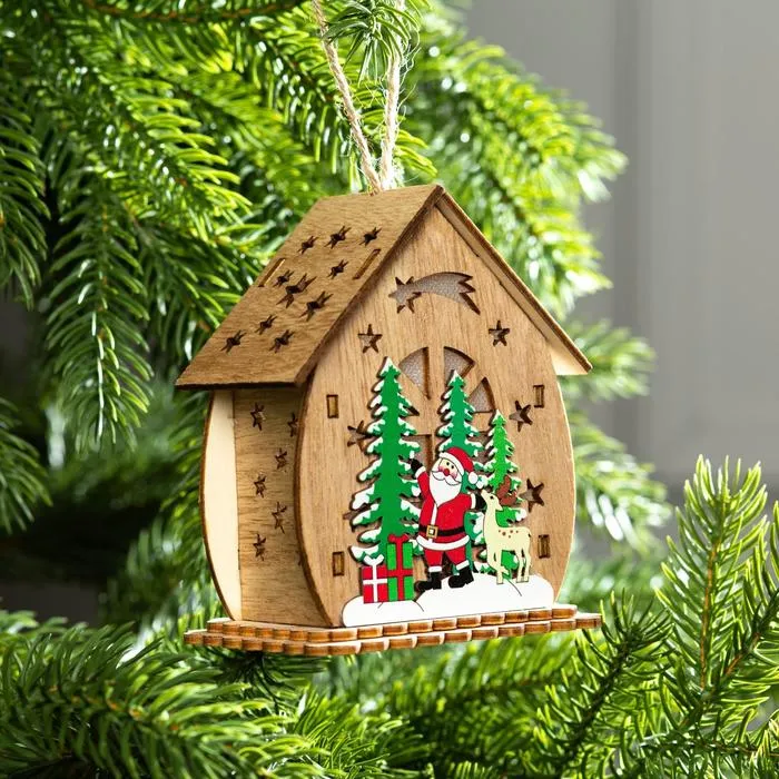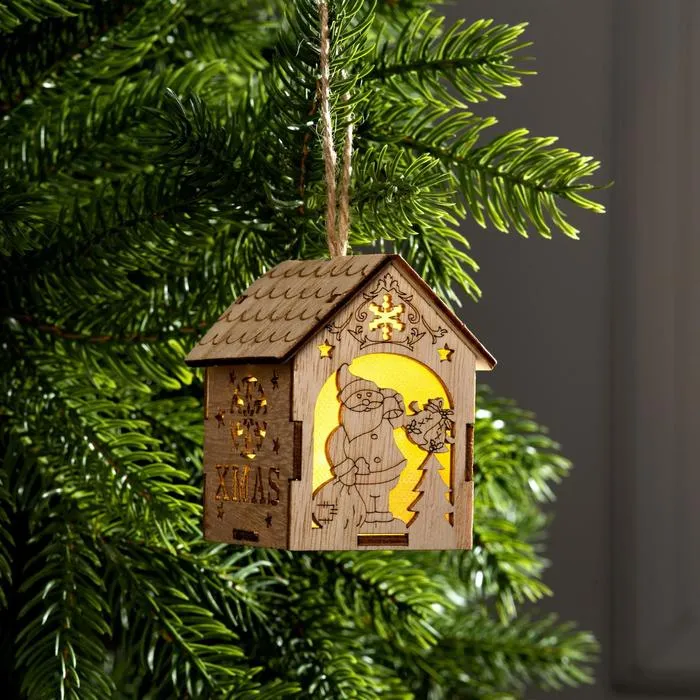 Ёлочная игрушка «Домик с Дедом Морозом и ёлкой», от батареек, свечение тёплое белое — Характеристики