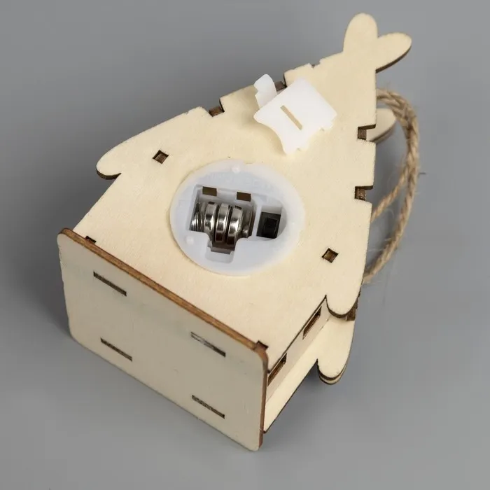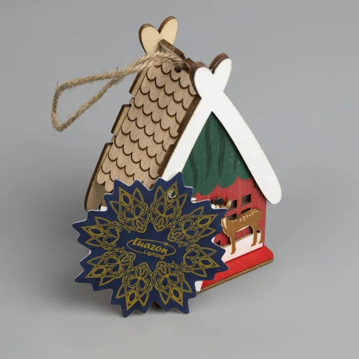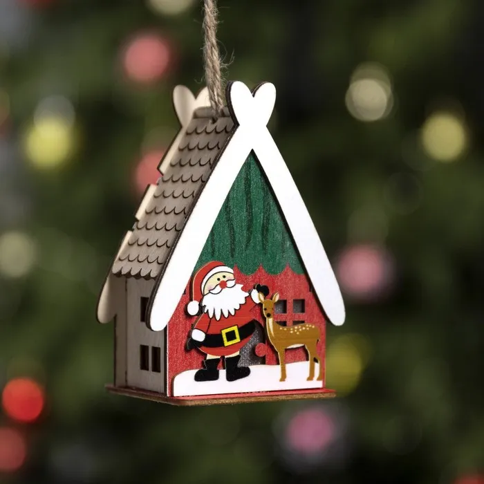 - Натуральный материал: Изготовлен из дерева, что обеспечивает долговечность и экологичность. Легкость материала позволяет без труда закрепить домик на ветвях ёлки.