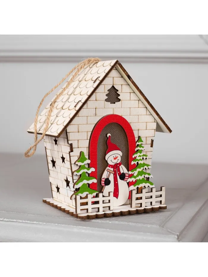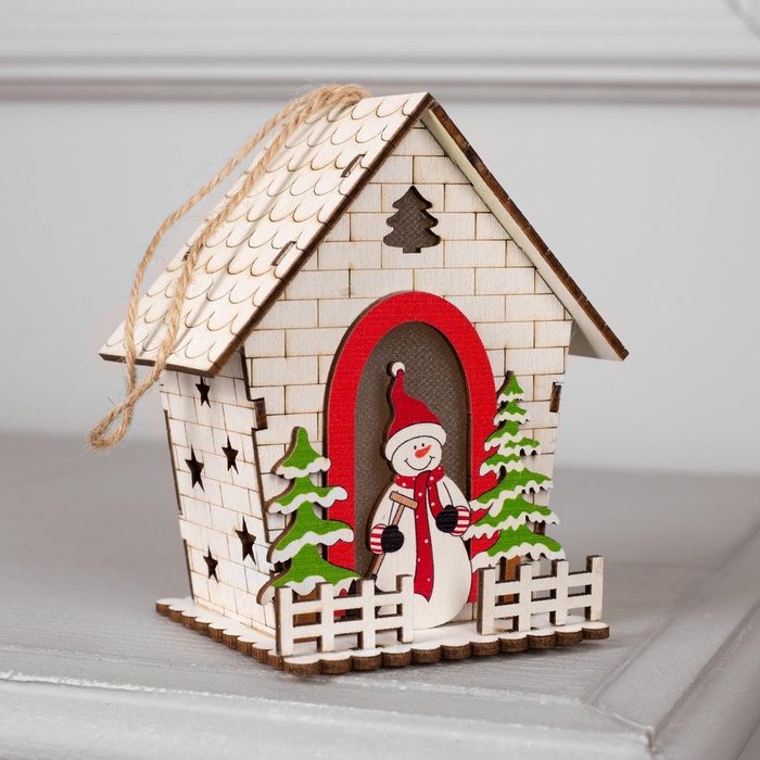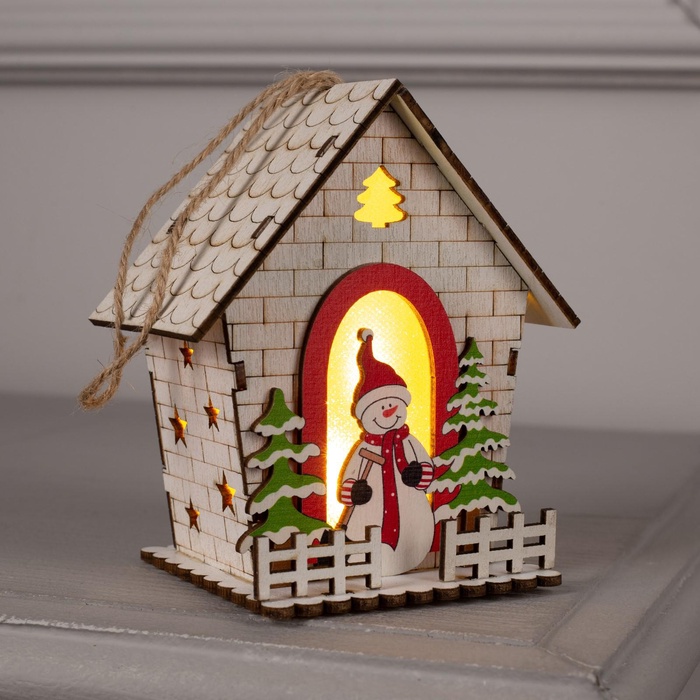 Ёлочная игрушка «Домик со снеговиком», 12 см, 1 LED, от батареек, свечение тёплое белое
