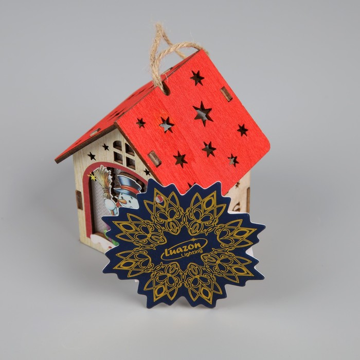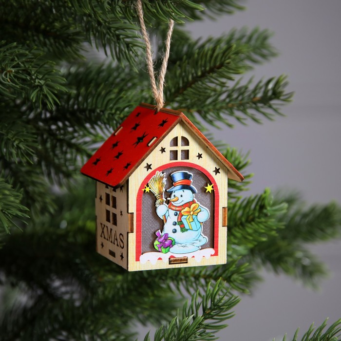 Ёлочная игрушка «Домик со снеговиком», 8х7х6 см, 1 LED, от батареек, свечение тёплое белое