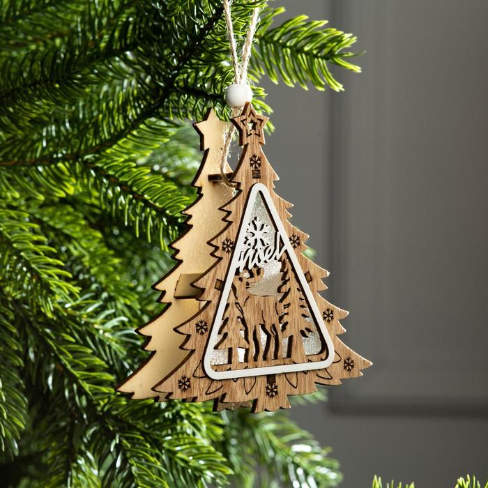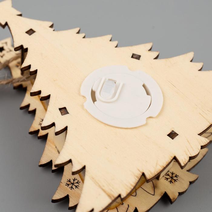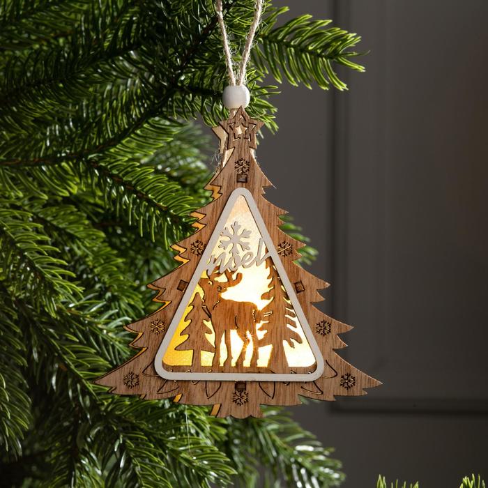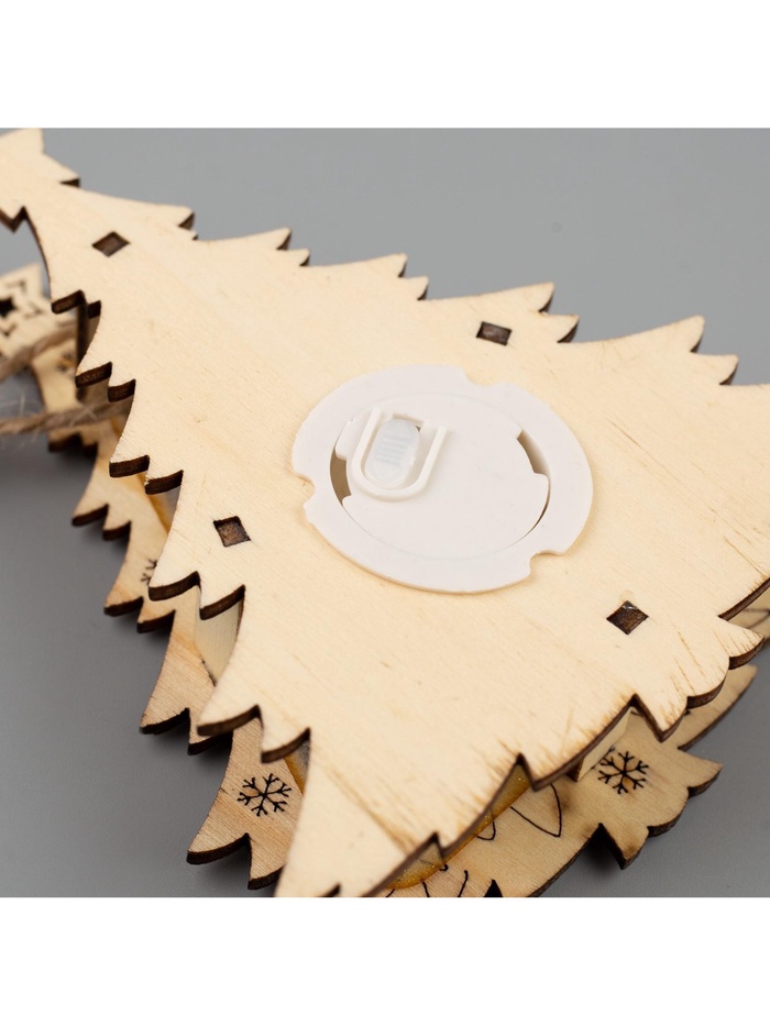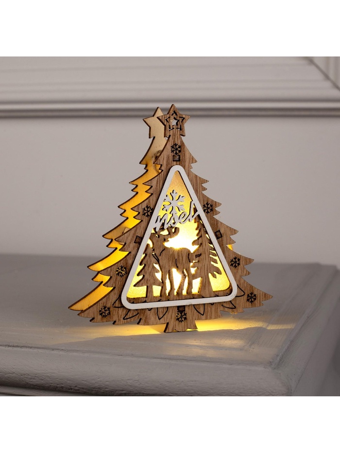 Светящееся деревянное украшение «Ёлочка с оленем» — новогодняя фигурка в скандинавском стиле с тёплым свечением. Игрушка диаметром 11 см полностью готова к празднику — батарейки LR41 уже вложены в комплект.