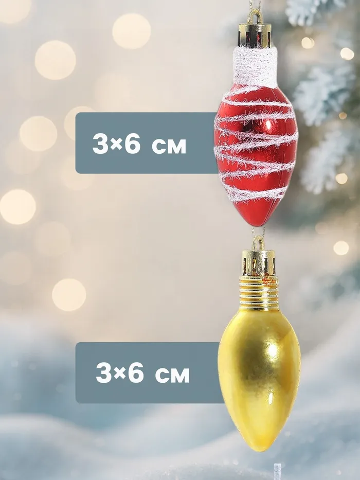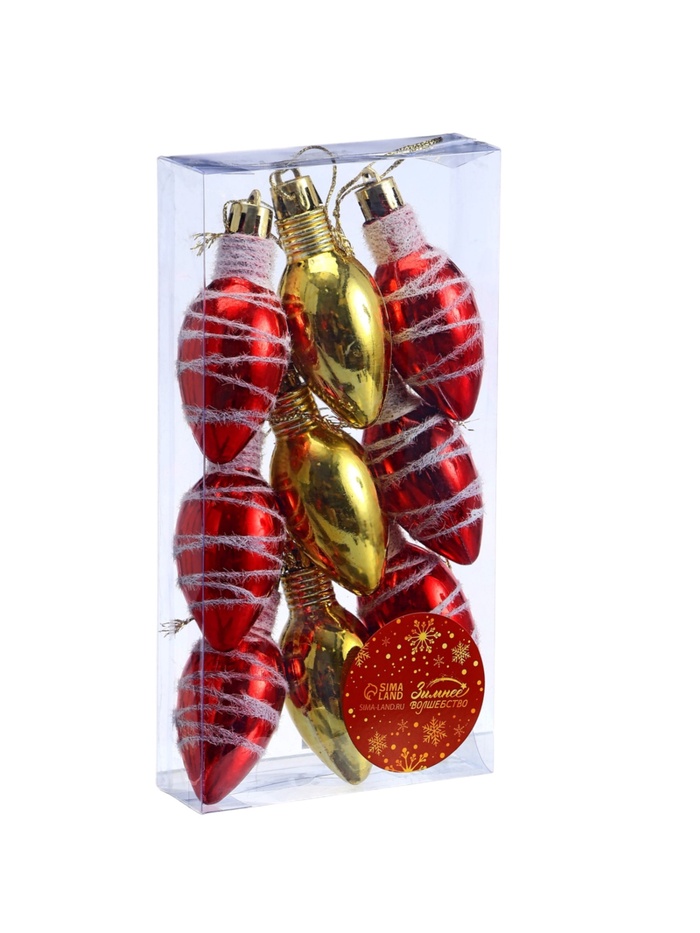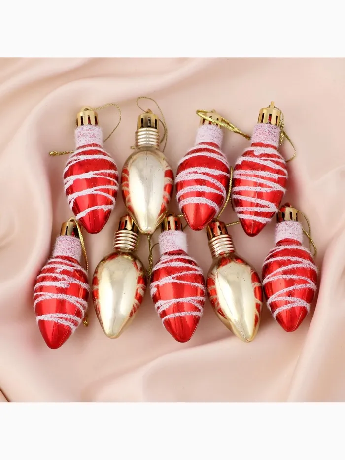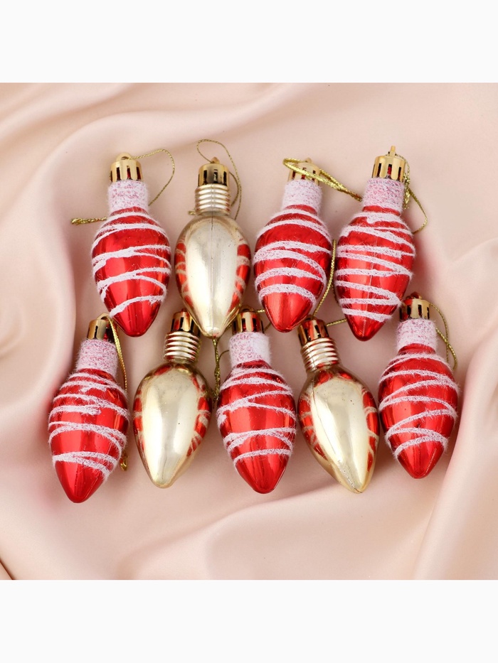 Набор новогодних ёлочных украшений в форме классических лампочек — это сочетание традиций советского дизайна и праздничного настроения. Девять разноцветных игрушек высотой 6 см с полосатыми рисунками придают ёлке выразительность и разнообразие. Цветовая гамма варьируется от тёплого золотистого до насыщенного красного, что создаёт уютную атмосферу и подчёркивает праздничный стиль.