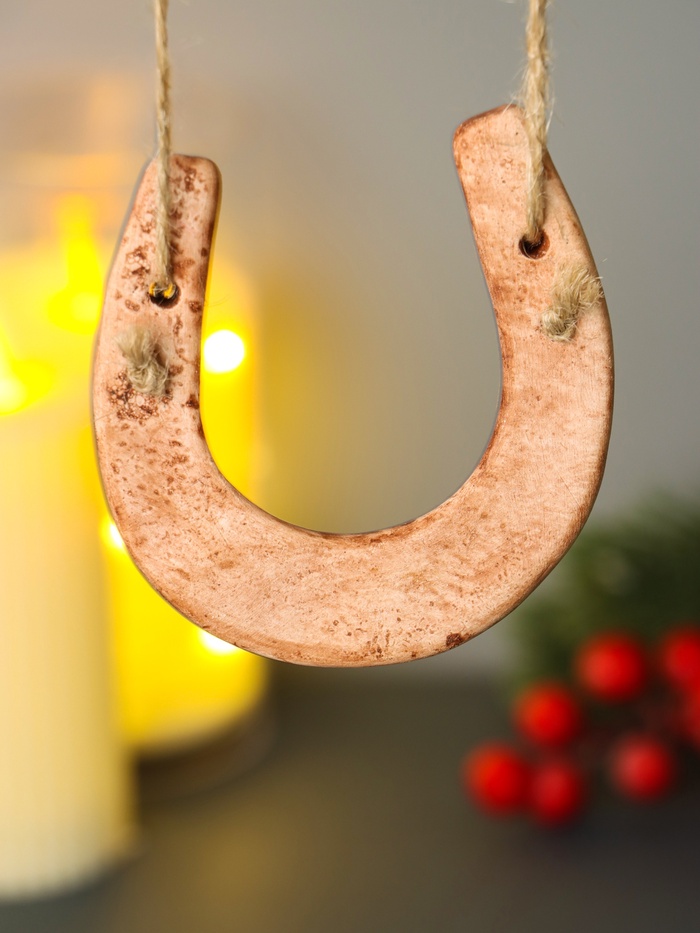 Эта изящная подвеска в форме подковы выполнена из керамики с золотистым оттенком, который придаёт ей особую праздничную теплоту и изысканность. Символ года 2026 — Лошадь — гармонично отражён в дизайне, делая украшение не только красивым, но и наполненным смыслом удачи и благополучия.