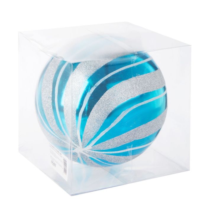 Новогодняя игрушка «Полосы» — это крупный и стильный шар для украшения ёлки в серебристо-голубой гамме. Изделие диаметром 20 см выполнено из пластика с рисунком и оформлено в духе шебби-шик и фьюжн-стиля. Это решение для тех, кто ценит нестандартные формы, свет и зимнюю эстетику праздника.