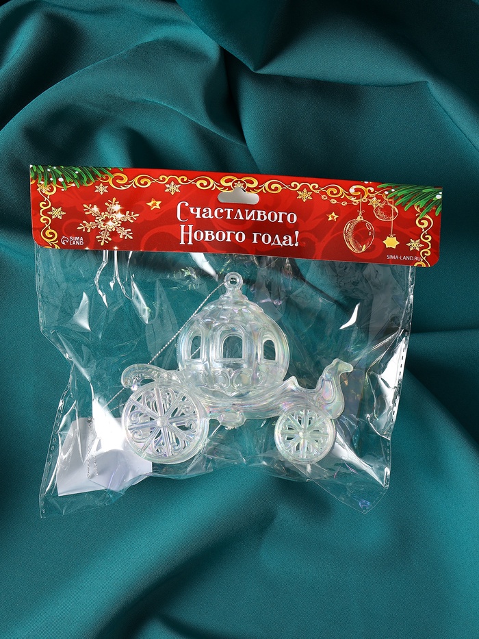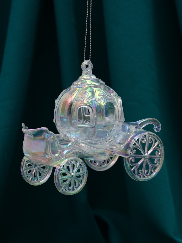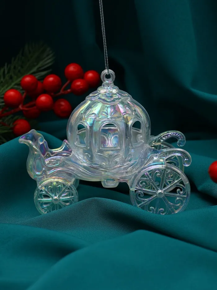 Прозрачная ёлочная карета с переливами станет изысканным украшением новогодней ёлки. Изготовленная из пластика, она сочетает лёгкость и прочность, подчёркивая праздничную атмосферу своим необычным сиянием и изящной формой.